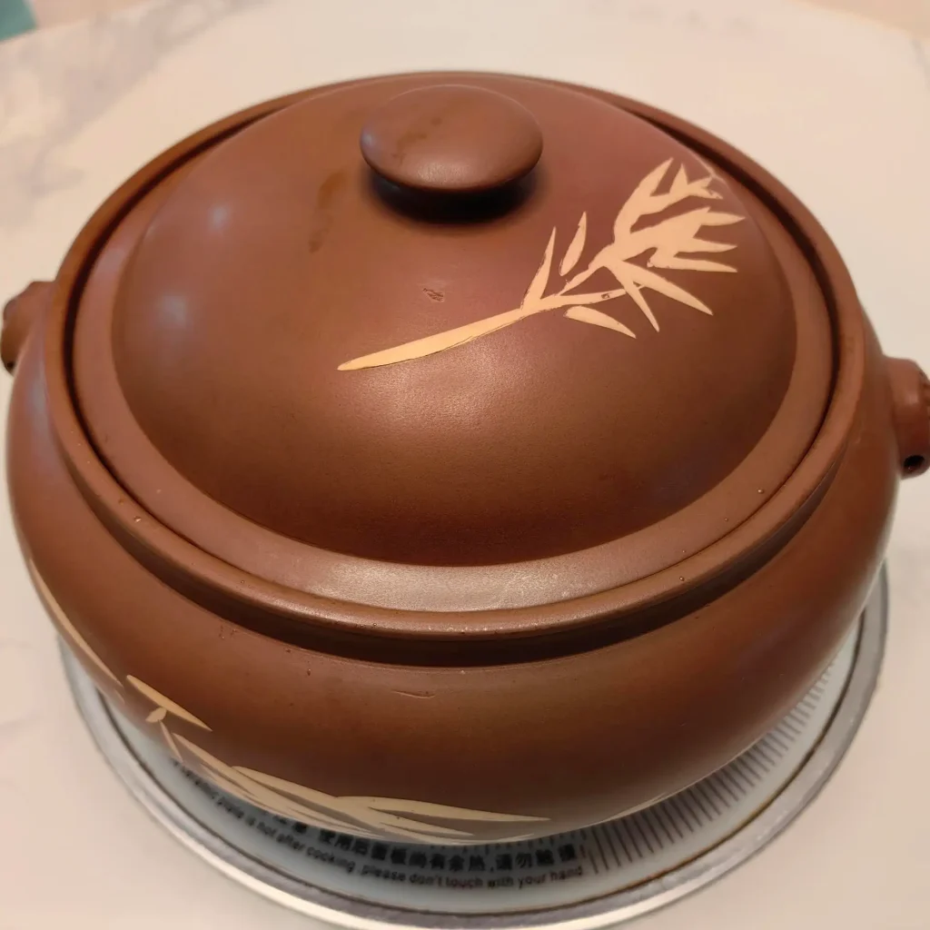 The chicken is cooked entirely by steam — no water, no oil is added. A special clay pot with a central chimney channels steam from below, which condenses inside the pot and slowly cooks the chicken over 3–4 hours. The result is extraordinarily tender meat and a broth of pure, concentrated chicken essence.